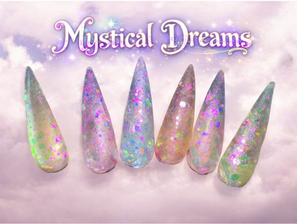 "Upgrade your nails to a dreamy masterpiece with Mystical Dreams Glitter Acrylics. These pastel nail powders will add a magical touch of sparkle to your manicure. Say farewell to dull boring nails and hello to the enchanting art! Of Mystical Dreams“ our Mystical Dreams nail powder collection is Available exclusively in 1/2 Collection or 1 Oz jars.
