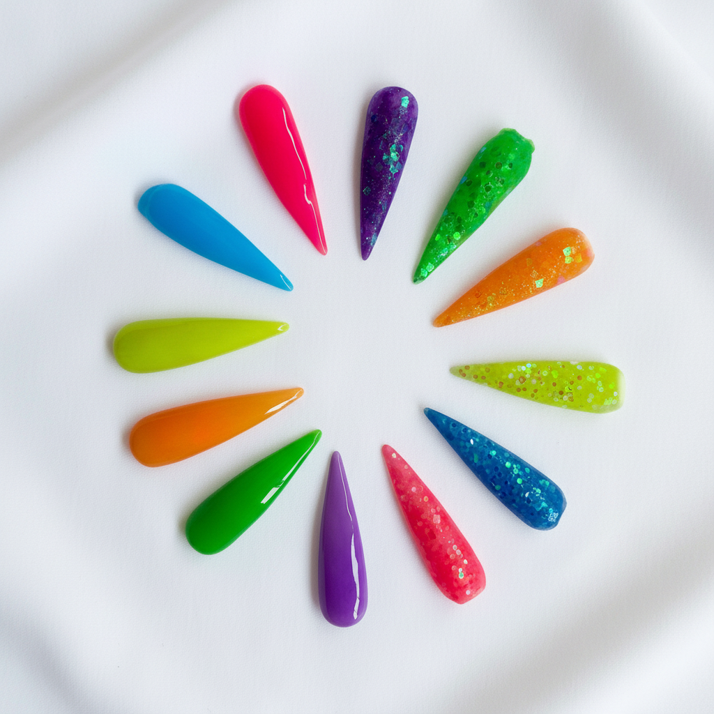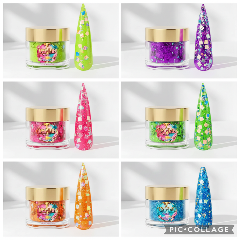 Hey Beauties, want an exciting and creative look to your nail sets? Our Custom made semi-translucent Neon Acrylics are made with high quality materials with a buttery smooth consistency that brings that pop of color, sprinkle of glitzy and style to your sets each time. they are easy to use, beginner friendly and not to mention easy on the budget. So stock up and enjoy the attention from everyone asking about your nails. Acrylics especially with glitter should be encapsulated with clear acrylic and finished with shiny or matte top coat for a unique look.  Suitable for the beginner and experienced nail techs or enthusiast with an average dry time.