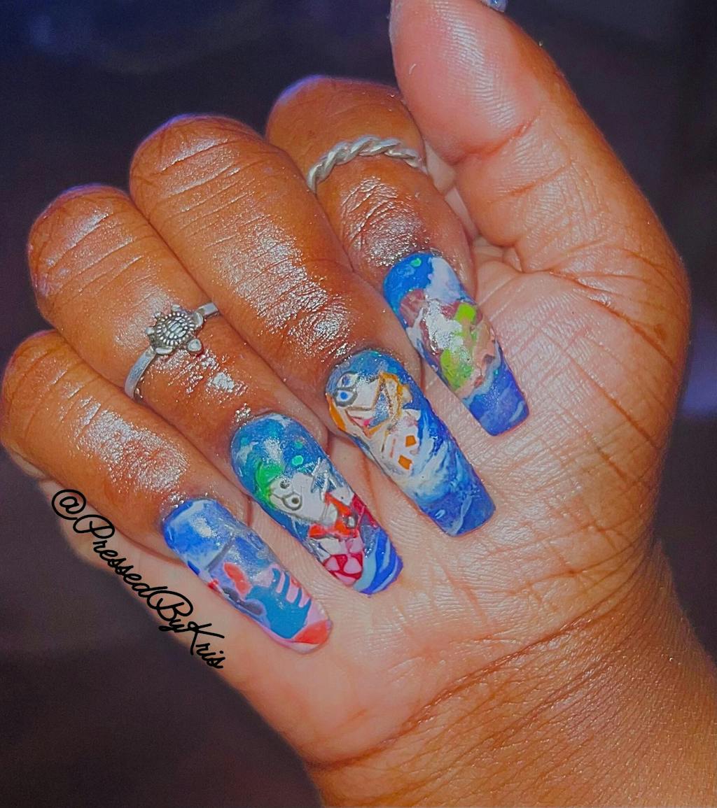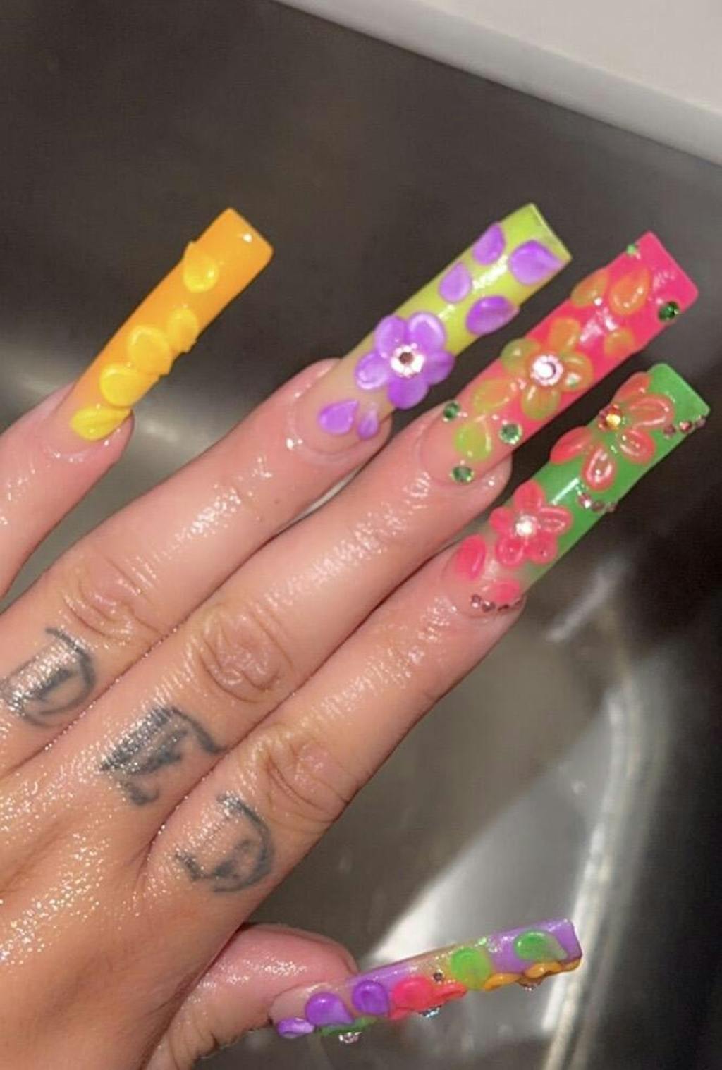 Neon nail acrylics with bright floral designs from the Neon Pool Party Collection on long nails against a vibrant background