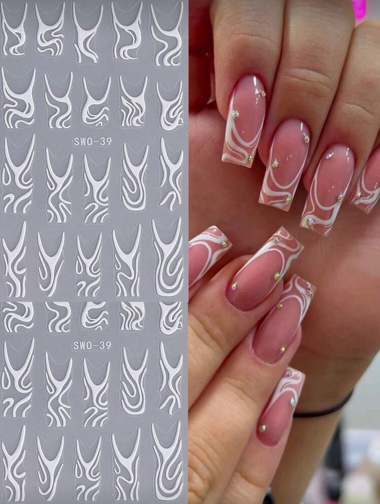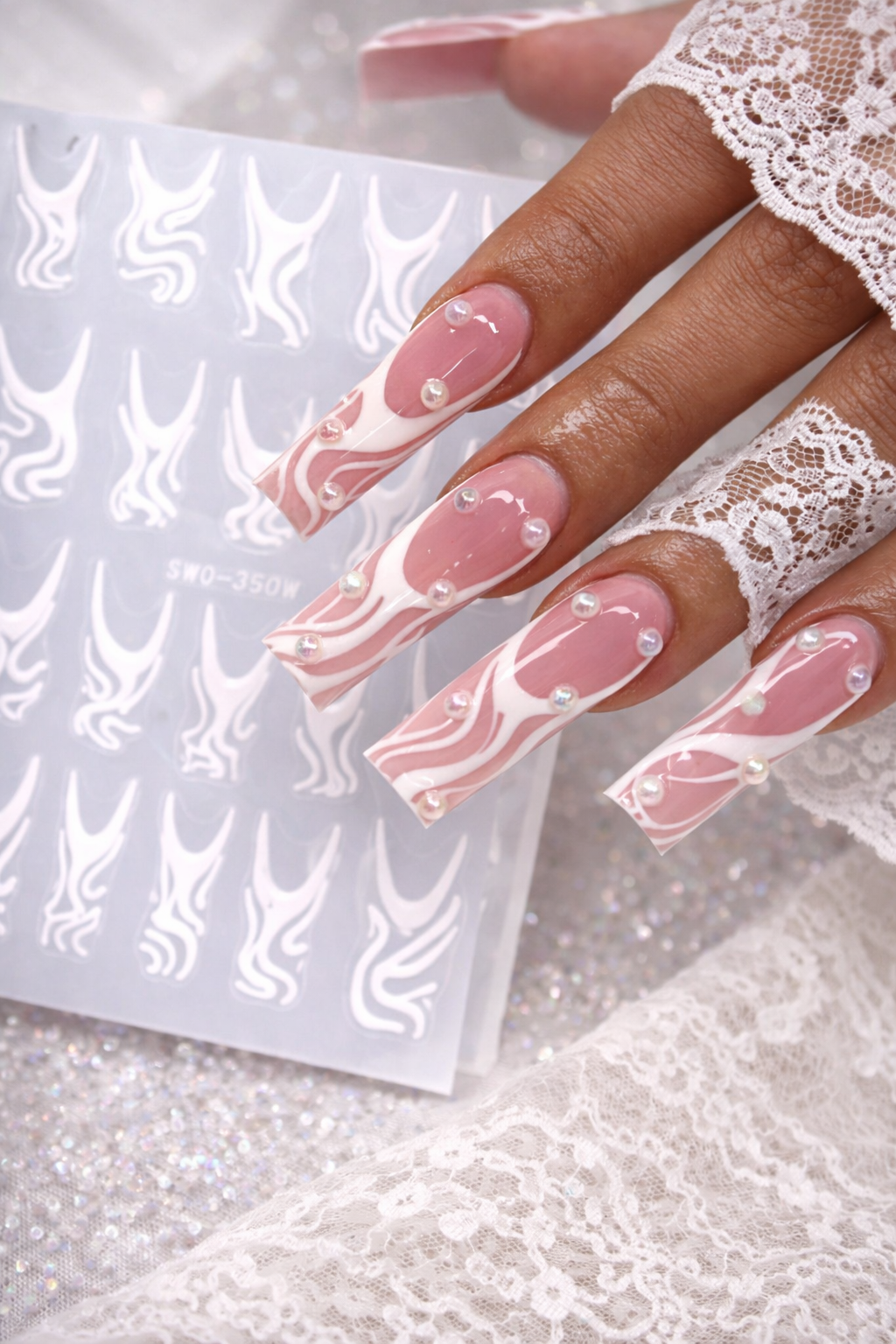 Soft, refined, and effortlessly chic — Sheer Elegance 2 piece nail stickers are designed for clean, wearable beauty you can enjoy day after day. Featuring delicate white swirl accents over a blush base with subtle pearl details, this set adds a polished touch without overpowering your look.