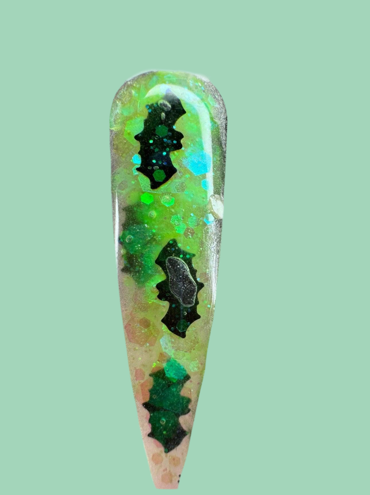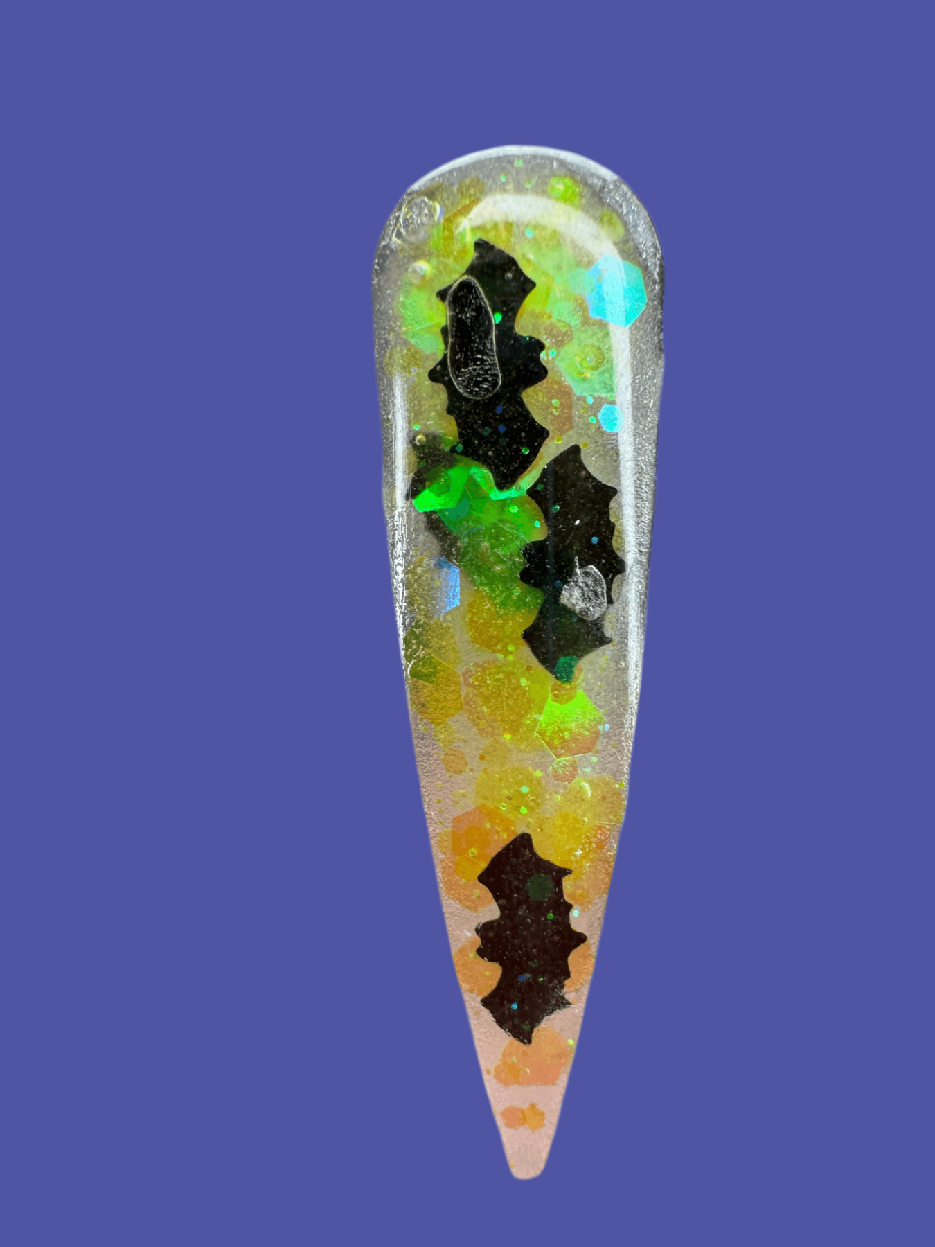 Glow in the dark Halloween acrylic nail art with spooky bats and green accents